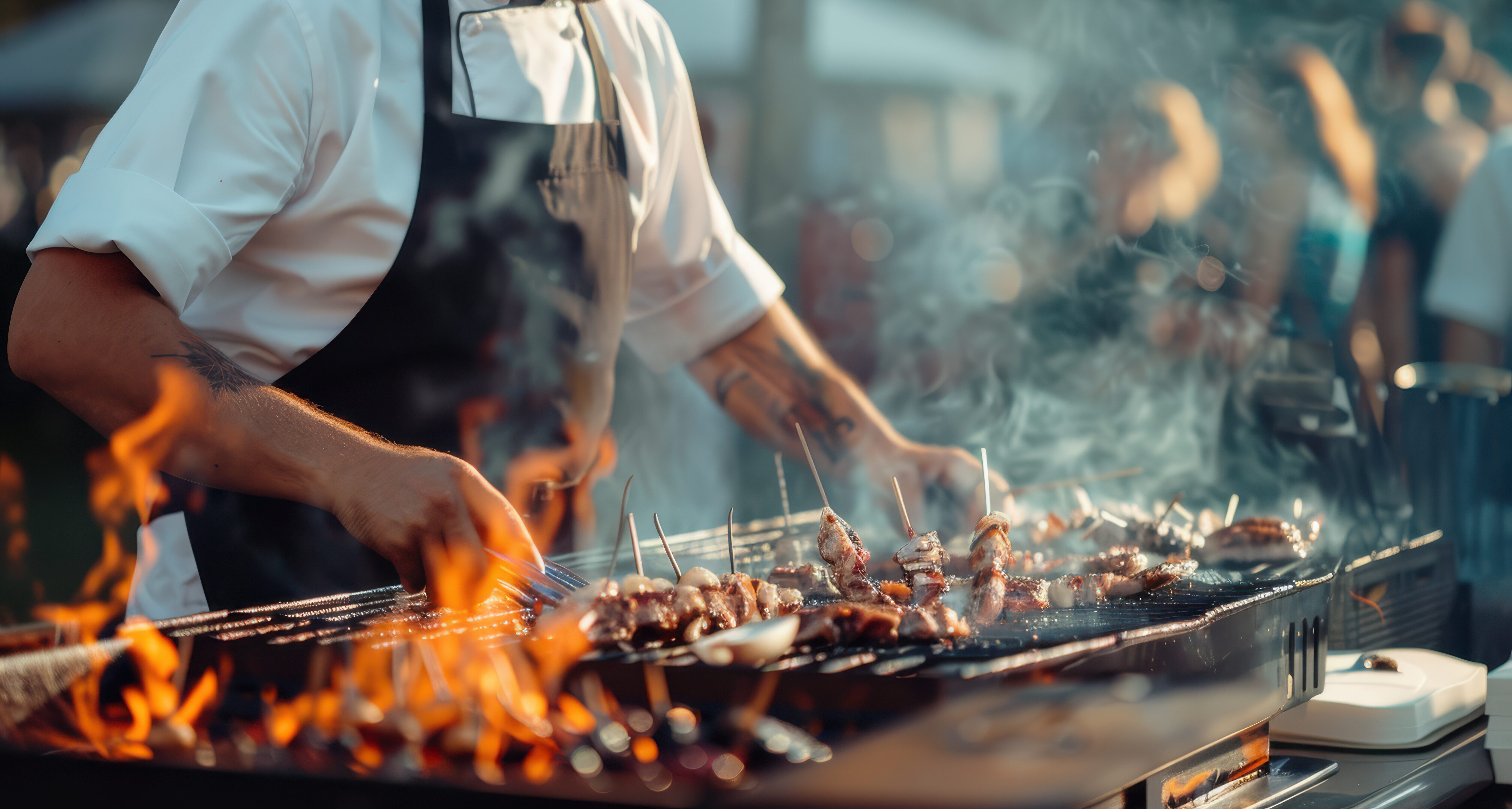 Großes Grillbuffet für 24,50 pP mit Rindersteaks, Hähnchenbrustfilet in Currymarinade, Schweinenackensteaks, Lachs mit Feta und Bratwurst Außerdem Gemüsespieße, gebratene Champignons und Rosmarienkartoffeln dazu Tomate-Mozzarella Salat,
