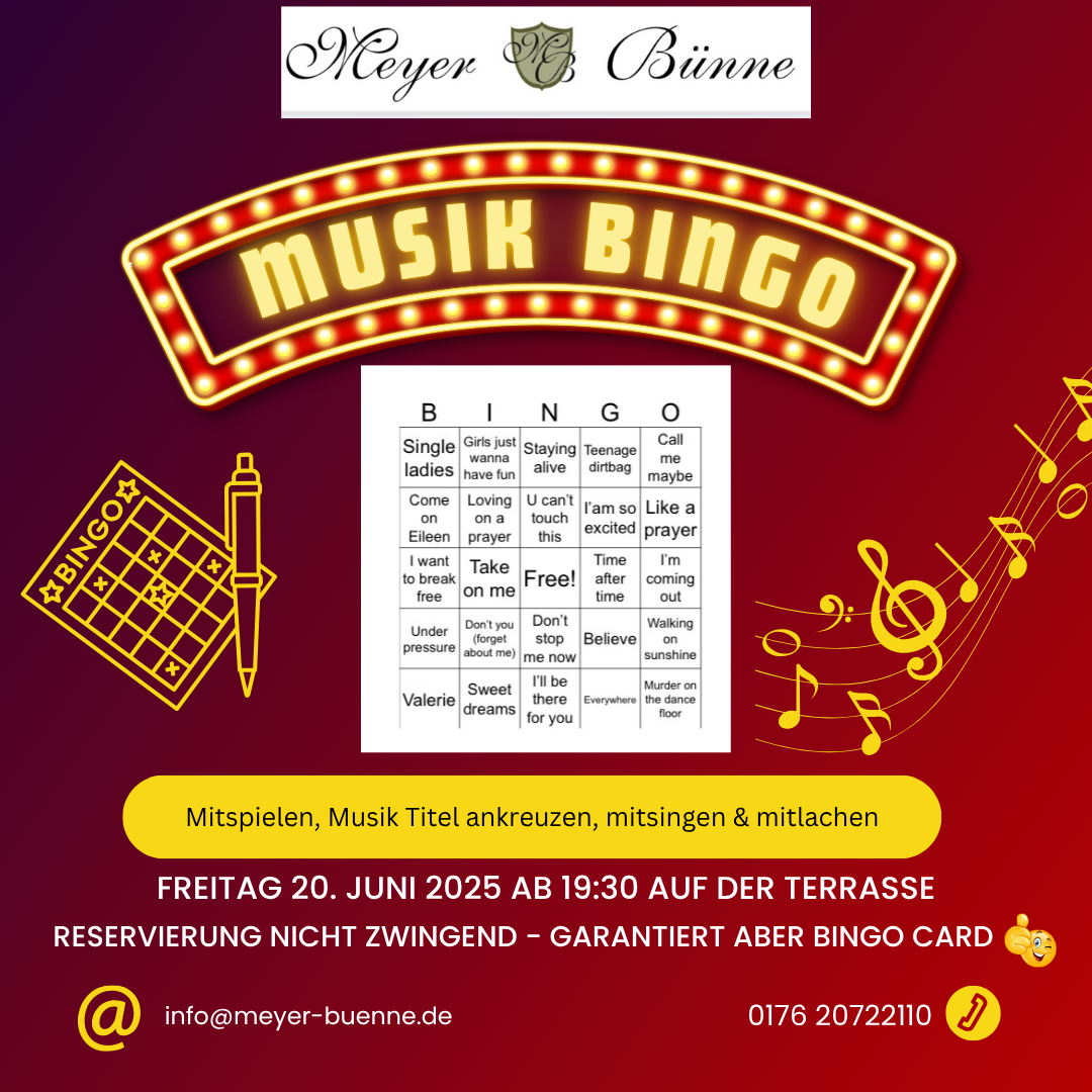 “Musikbingo” ist eine unterhaltsame Variante des klassischen Bingo-Spiels, bei dem die Zahlen durch Musiktitel oder Musikstücke ersetzt werden.