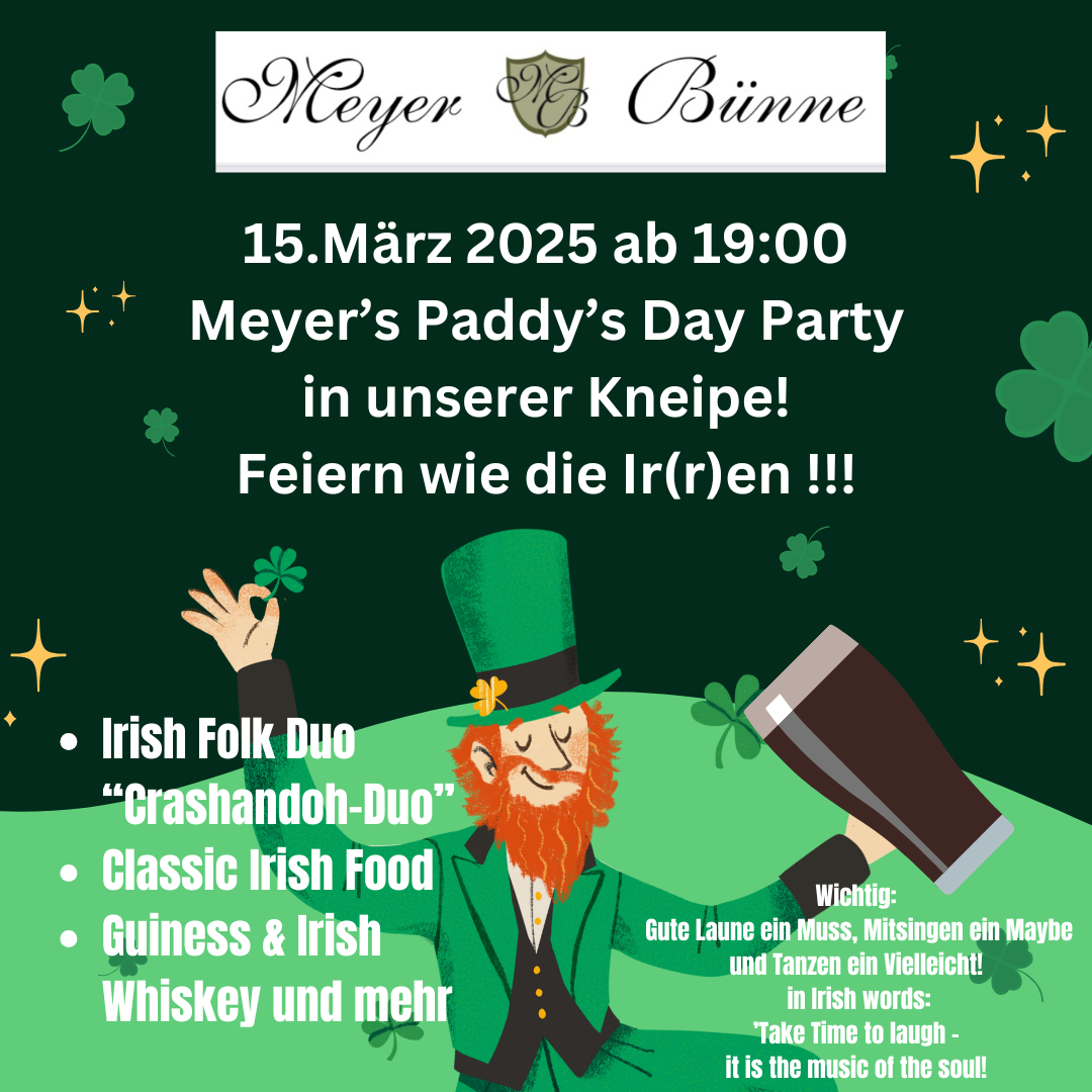 Am Samstag den 15. März 2025 um 19:00 sind bei Meyer Bünne „alle ein bisschen Irish“.